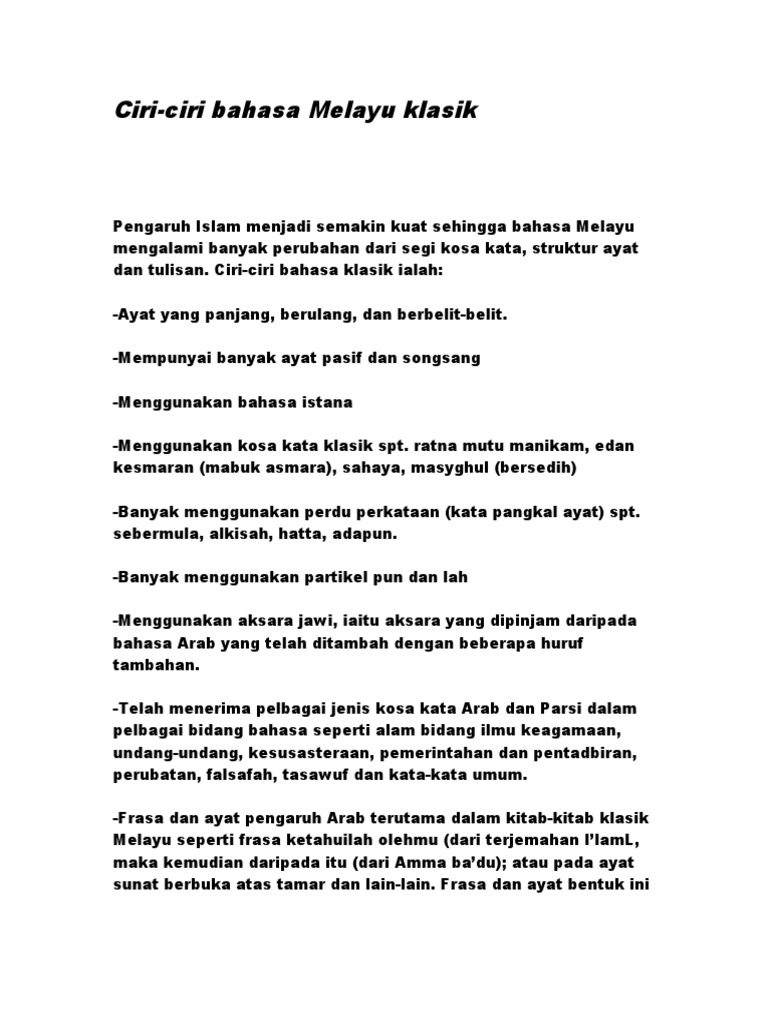 Ciri Ciri Bahasa Melayu Klasik Pdf